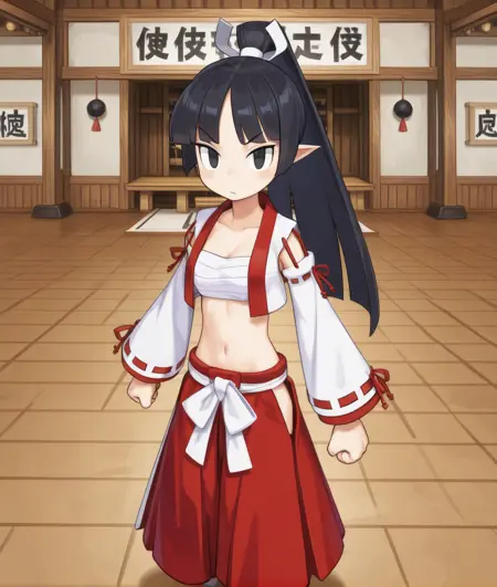 LadSam、黒髪、尖った耳、黒目、ポニーテール、髪リボン