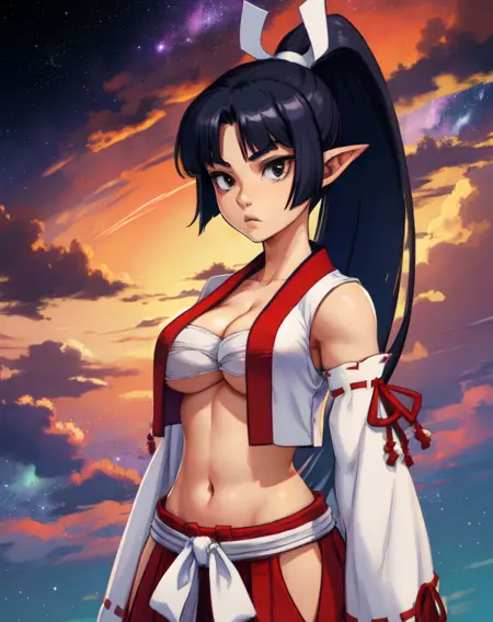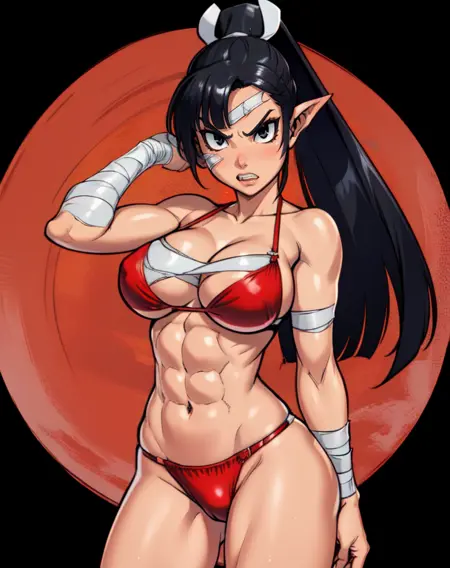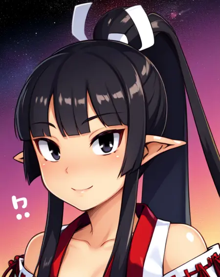 LadSam、黒髪、尖った耳、黒目、ポニーテール、髪リボン