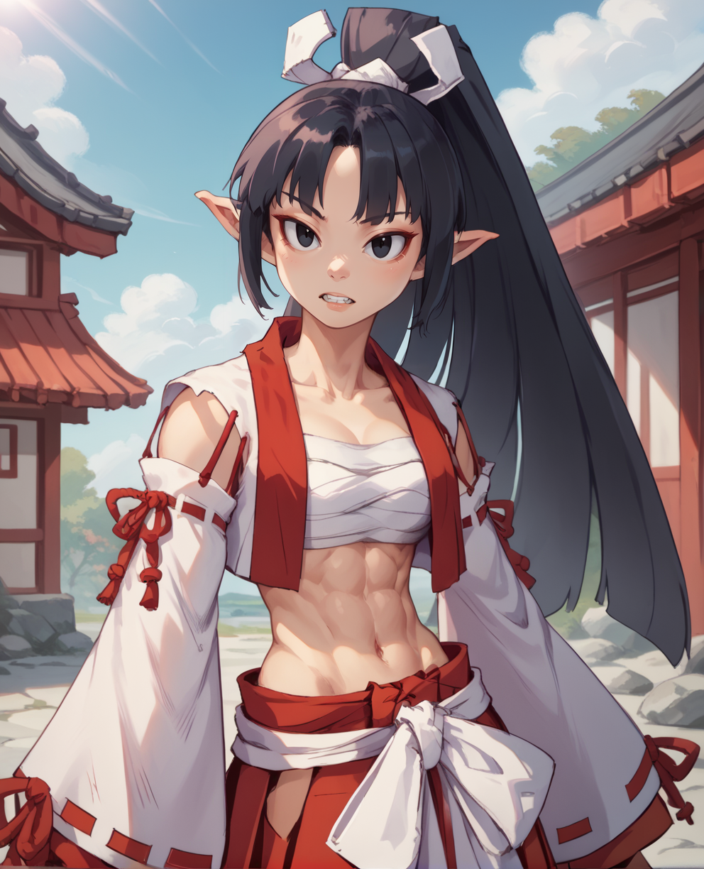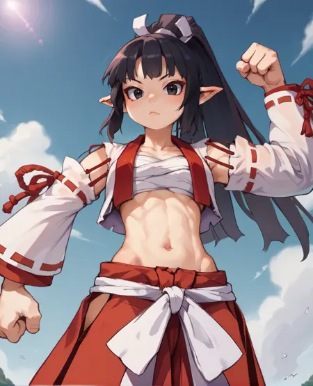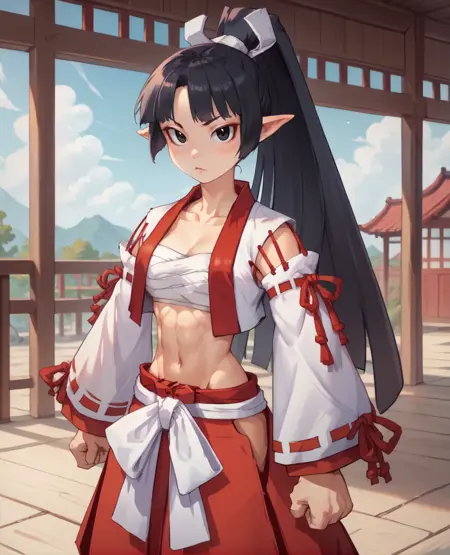 흰색 가슴 붕대 또는 사라시, - 분리된 소매 또는 리본 장식 소매, 흰색 오픈 베스트, 허리, 빨간 하카마 - 타비, 모래신발,