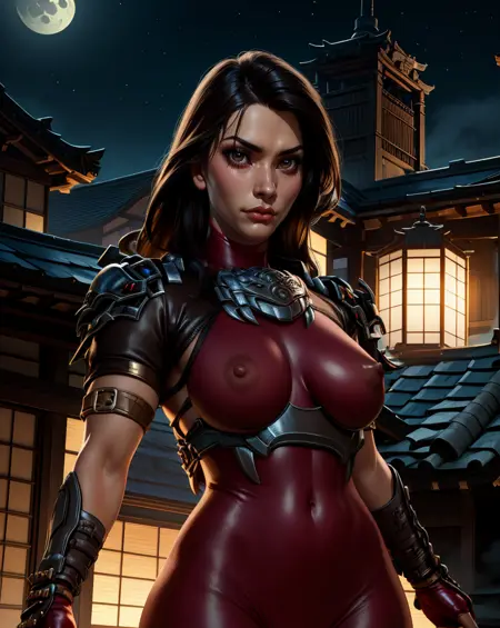 fingerless gloves, shoulder armor, arm guards, shin guards, leg armor, sandals, red bodysuit, japanese armor, hair ornament,