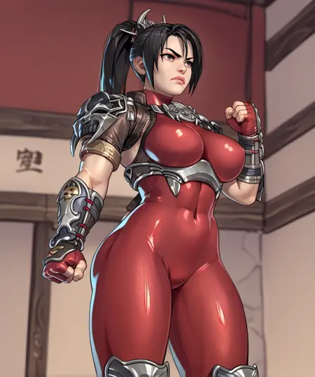 손가락 없는 장갑, 어깨 갑옷, 팔 보호대, 종아리 보호대, 다리 갑옷, 샌들, 빨간 바디수트, 일본 갑옷, 머리 장식