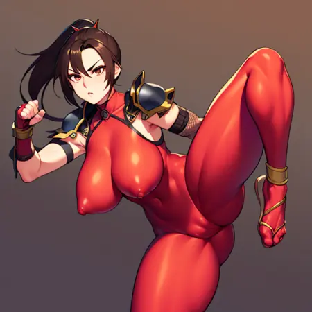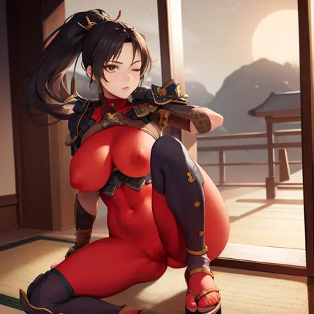 손가락 없는 장갑, 어깨 갑옷, 팔 보호대, 정강이 보호대, 하의 갑옷, 샌들, 빨간 바디수트, 일본 갑옷, 머리 장식,