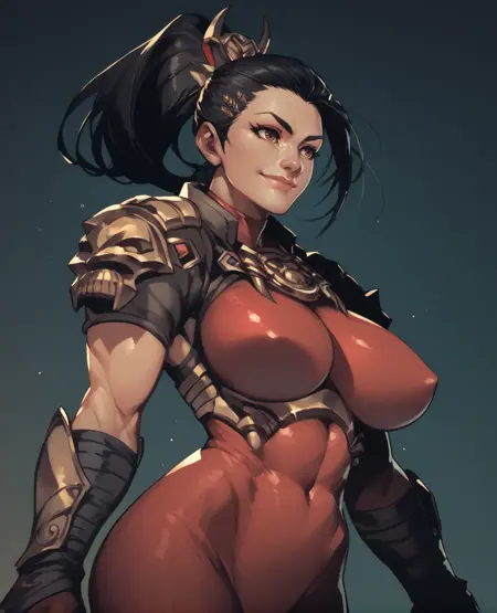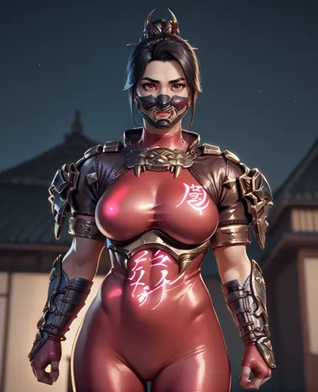 fingerless gloves, shoulder armor, arm guards, shin guards, leg armor, sandals, red bodysuit, japanese armor, hair ornament,