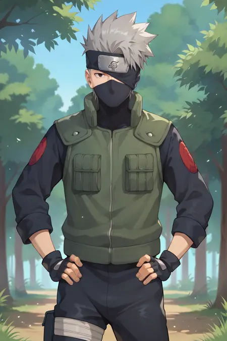 태그: kakashihatake, solo, mask, mouth mask, forehead protector, gloves, ninja, white hair, fingerless gloves, scar, black gloves, red eyes, grey hair, vest, scar across eye, konohagakure symbol, spiked hair, scar on face, heterochromia, short hair