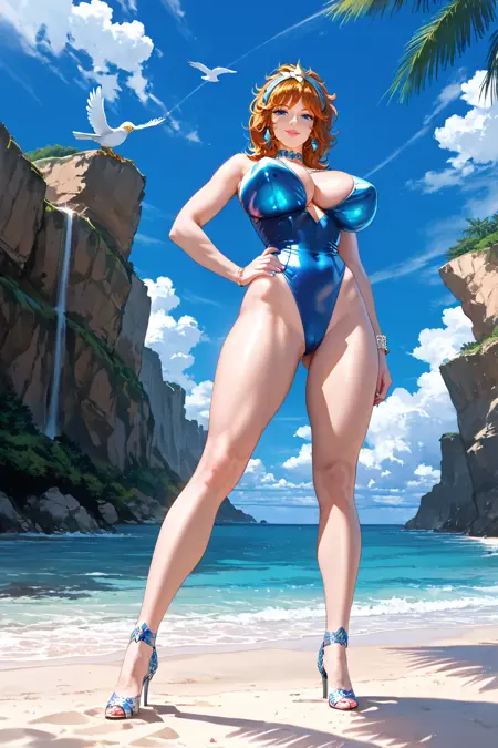 eagle marin,orange hair,brown hair,hair ornament,bird hair ornament,armor,leotard,blue eyes