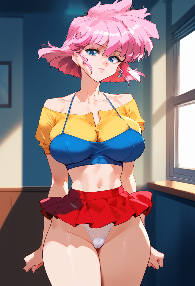 触发词:ruribtr、粉发女性、短发、耳环、大乳房、蓝眼睛、裙子、白色内裤、露脐