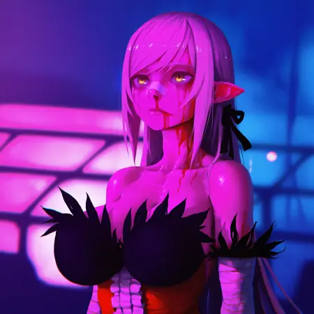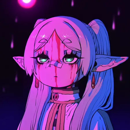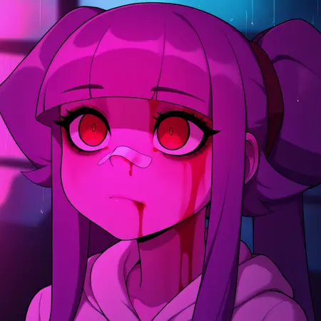基础提示词:portrait, bandaid on nose, blurry background, pink lighting, night, dark, pink theme