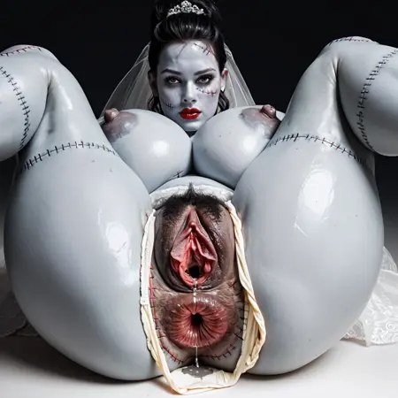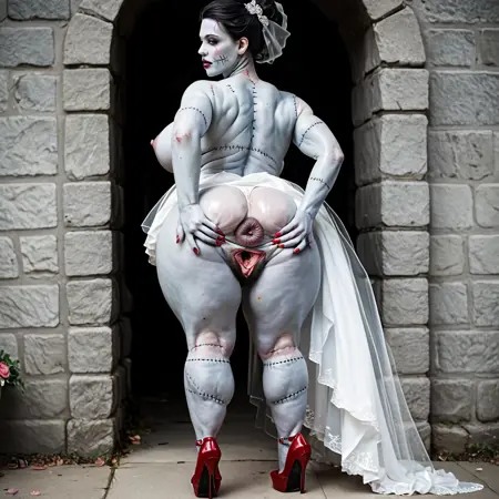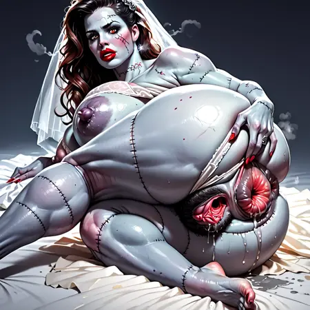 フランケンシュタインの花嫁:フランケンシュタインの花嫁、灰色の肌、ウェディングドレス、ゾンビ、人間なし、傷跡、縫い目、パッチワークの生物、