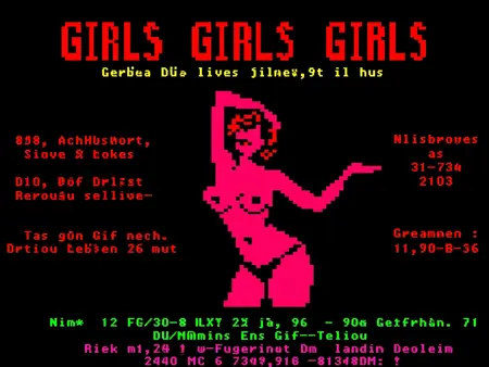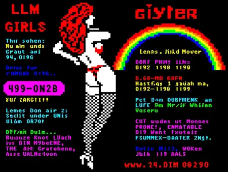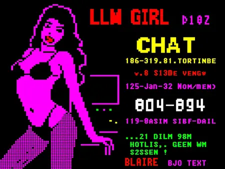 该模型能够重现低保真电传文本图形,并基于最近一则爆款视频中出现的德语成人聊天广告电传文本图像进行训练。我正在收集更多电传文本艺术作品,并将很快发布一个更广泛、更少成人导向的风格。