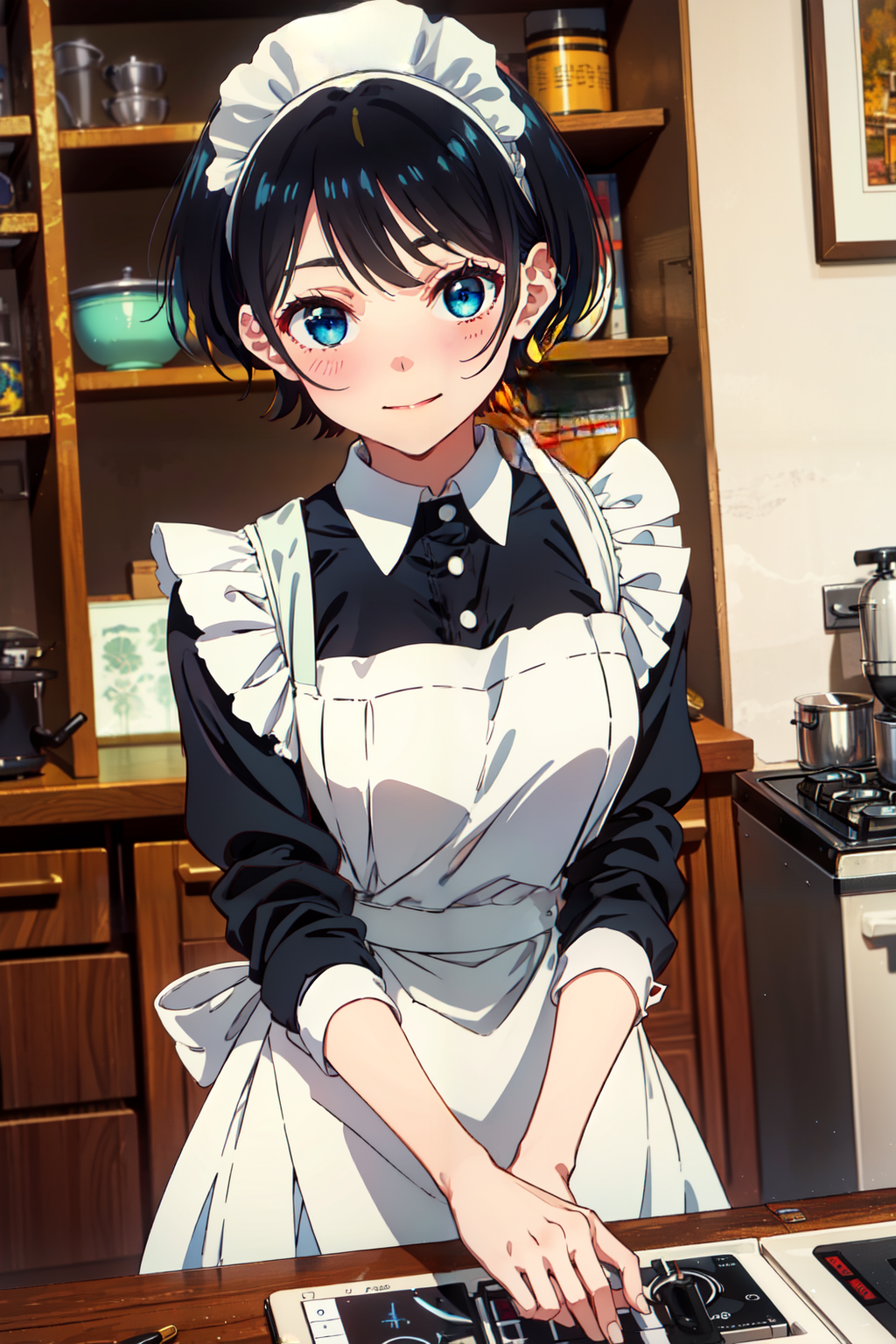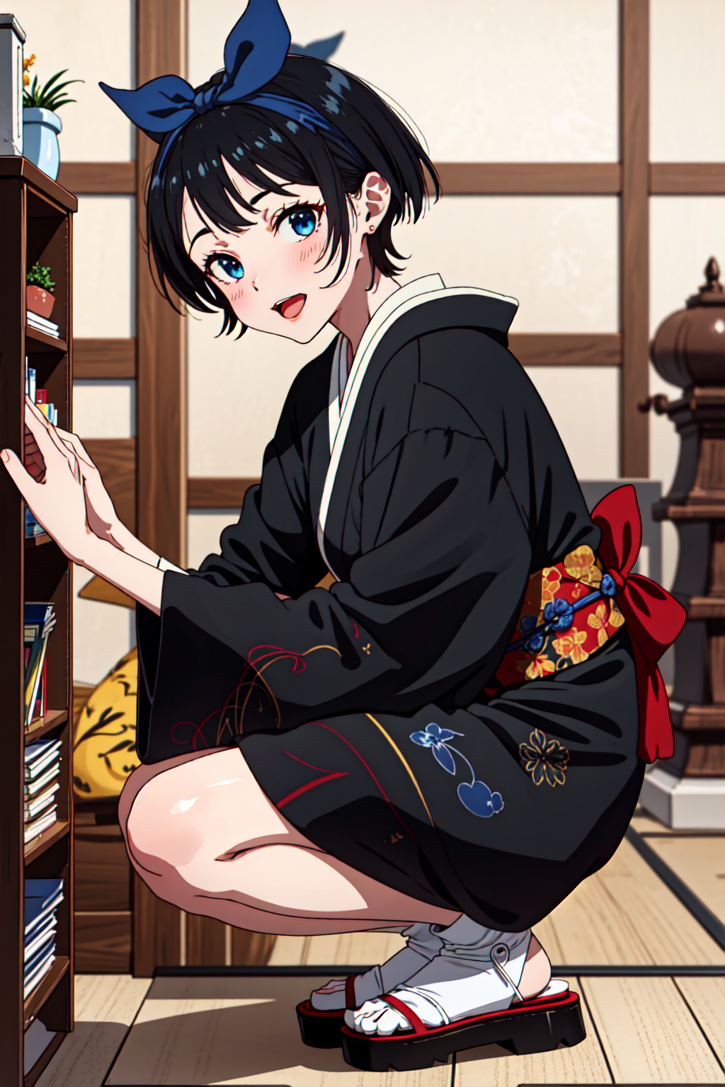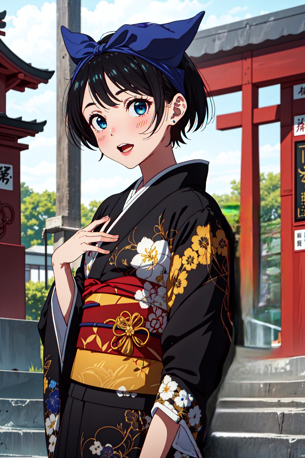 📌 프롬프트: Sarashina Ruka, 검은 머리, 파란 헤어밴드, 머리에 파란 리본, 단발, 파란 눈, 교복, 검은 플리츠 치마, 검은 재킷, 녹색 줄무늬 넥타이, 긴 소매, 스웨터 조끼,