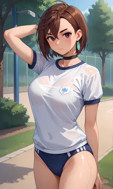 ayase_momo, red eyes, brown hair, short hair, pendant earrings, choker