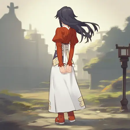 프롬프트: Claret_SN, 검은 머리, 중앙으로 갈라진 앞머리, 비대칭 앞머리, 긴 머리, 겹치는 셔츠, 빨간 셔츠, 앞치마, 허리띠, 율리엣 소매, 긴 소매, 흰 치마, 긴 치마, 발목 부츠