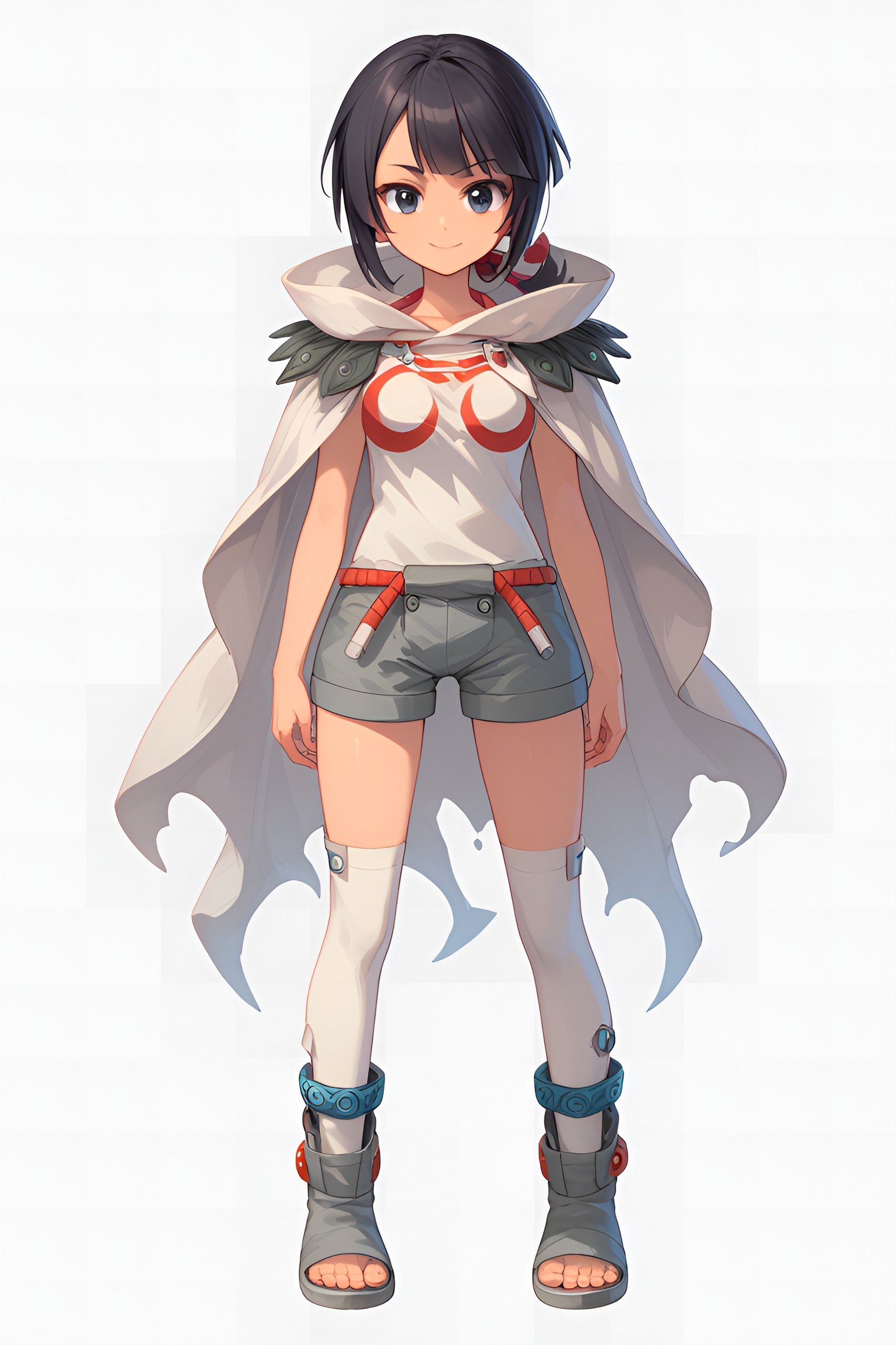 • 短裤, 无趾鞋, 过膝袜, 超膝袜, 斗篷, 灰色短裤, 短款短裤, 饰品, 灰色过膝袜, 脚链, 站立, 白色背景, 微笑, 腰带, 披风, 上衣