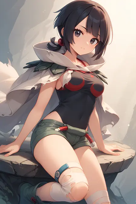 • 1girl, solo, 黑发, 短发, 红眼, 短马尾, 刘海