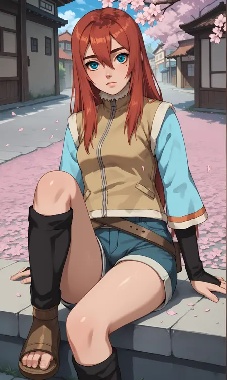 갈색 조끼, 파란 셔츠, 넓은 소매, 긴 소매, 반바지, 팔꿈치 장갑, 신부 장갑, 반바지 벨트, 발가락이 없는 양말, 샌들