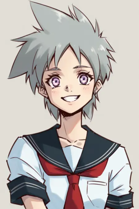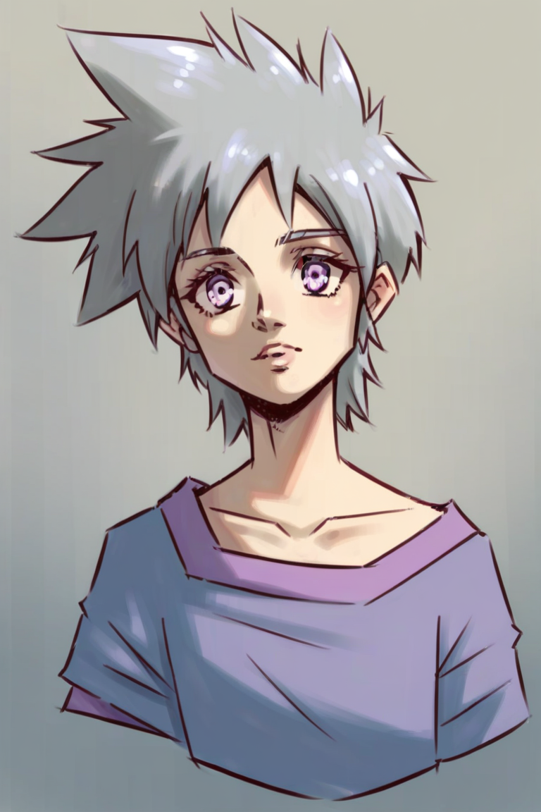 1girl, small breasts, short spiky grey hair, purple eyes, blank stare