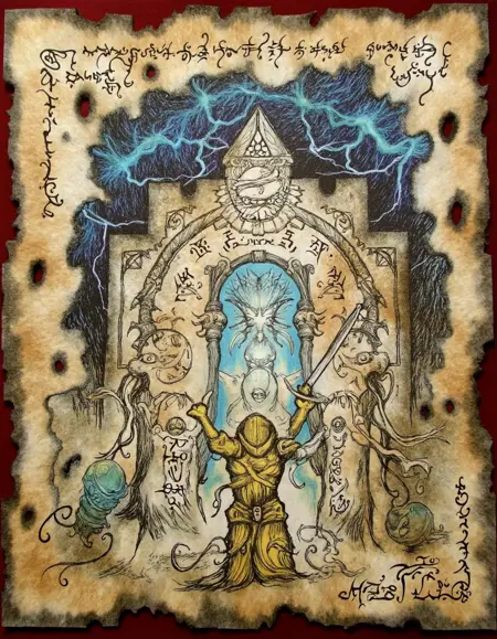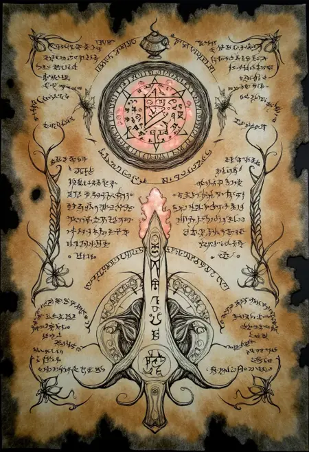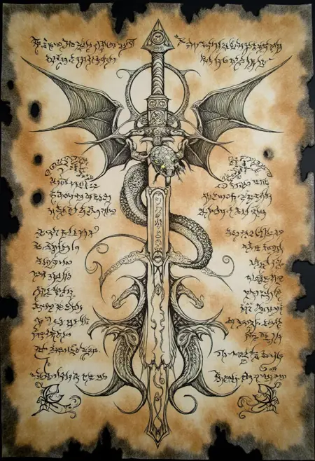 The first version of The Forbidden Book was trained on a large number of captionless images. The overall style was captured well, and it transformed a good number of prompts into torn and better-forgotten pages. Its best to start describing the medium, then the primary illustrations, and then how the runes and symbols will flow throughout the page.