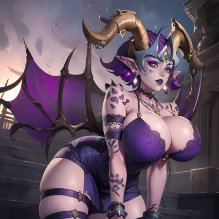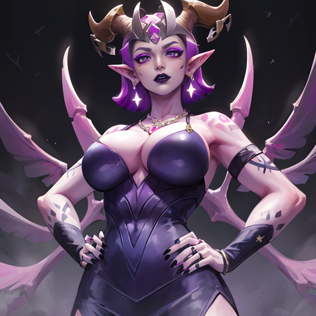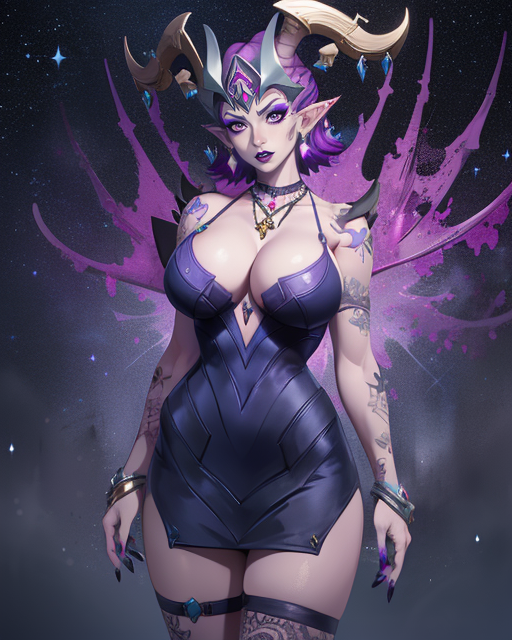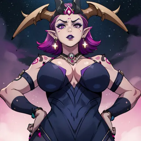 Nyx、ピンクの目またはパープルの目、濃いパープルの唇、パープルの肌またはピンクの肌、尖った耳、後ろに流した髪、角
