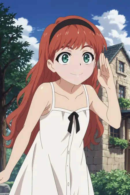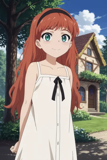 Triggers : frill,1girl,solo,smile,hairband,dress,red hair,black hairband,freckles,white dress,collarbone