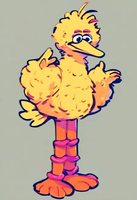 BigBirdSS, 1boy, bright yellow feathers, large black eyes, yellow beak, orange feet, orange legs with pink stripes, yellow tail, no humans,
