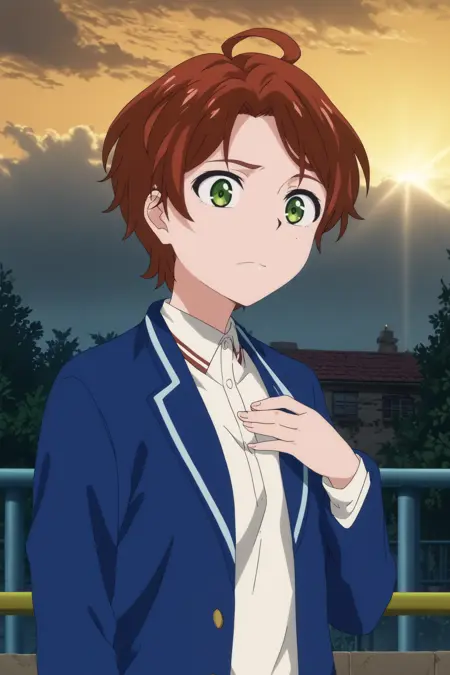 트리거: sawaki momoe, 1girl, solo, short hair, ahoge, brown hair, blue jacket, school uniform, mole under eye, mole, shirt, white shirt, collared shirt