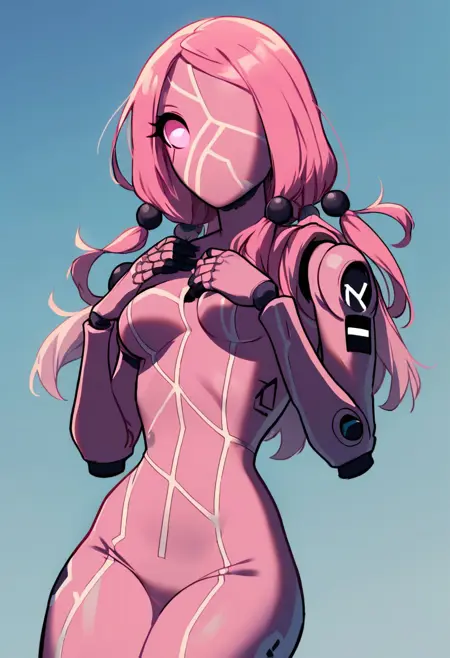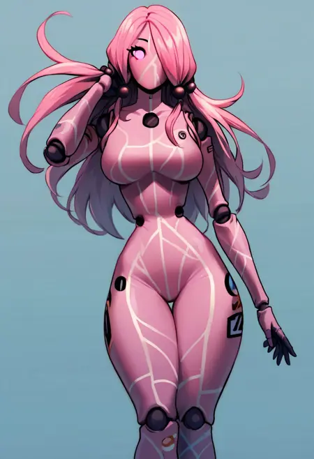 Paispark, 1girl, colored skin, pink hair, pink eye, no pupil, bodysuit, medium breasts, long hair, (one eye:1.2), hair ornament, thin waist, wide hips, shoulder joints, elbow joints, wrist joints, blue joints, knee joints,