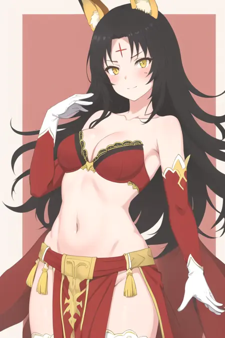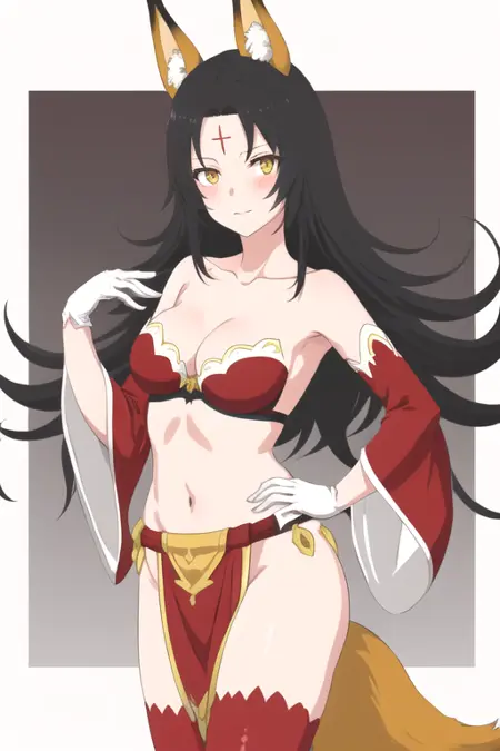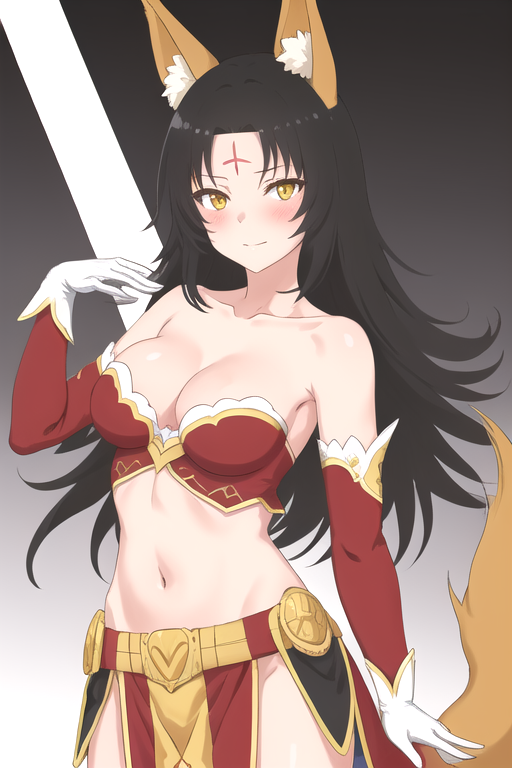 | 학습된 단어 | Magino25D, 1girl, solo, long hair, medium breasts, black hair, red thighhighs, elbow gloves, navel, animal ears, cleavage, bare shoulders, collarbone, yellow eyes, detached sleeves, midriff, white gloves, parted bangs, fox ears, fox girl, pelvic curtain, forehead mark, loincloth, red bra, red sleeves복사됨! |