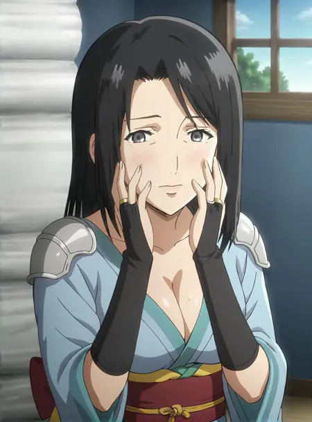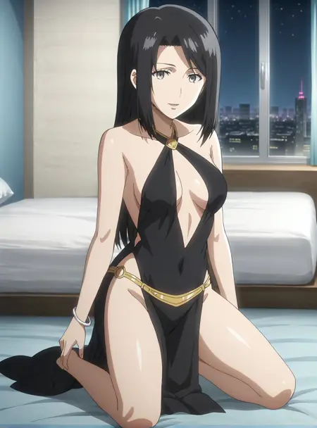 <lora:mikasas_mom-08:0.8>, mikasas_mom, black hair, 1girl, long hair, bracelet, jewelry, grey eyes, anime coloring, mature_female,