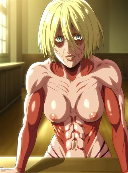 <lora:female_titan_s1:0.8>, female_titan_s1, female_titan, blonde hair, titan (shingeki no kyojin), blue eyes, muscular, hair between eyes, giant, large_breasts, abs, (multicolored_skin, colored_skin, red skin, pink skin:1.15), bags_under_eyes, (titan_\(shingeki_no_kyojin\),:1.2), (exposed_muscle:1.3),