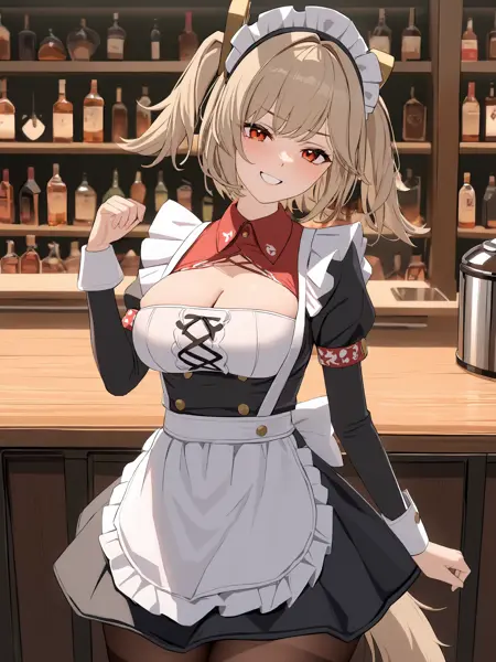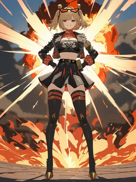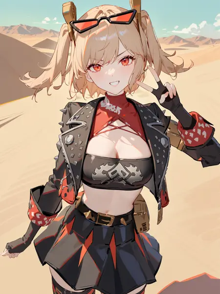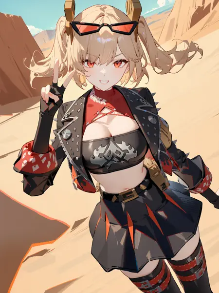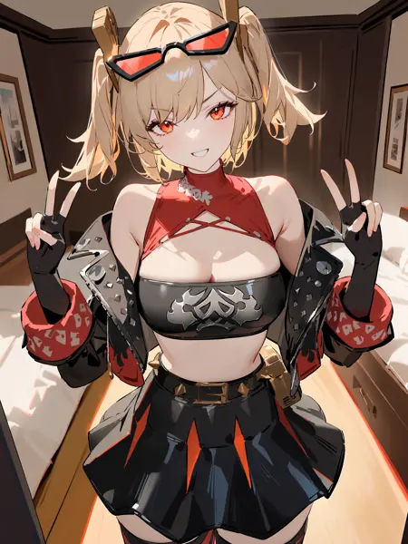 Additional prompts for her default in-game maid costume: twintails, hair ornament, black skirt, sunglasses on head, latex thighhighs, cropped jacket, fingerless gloves, sleeveless turtleneck, tube top, pumps