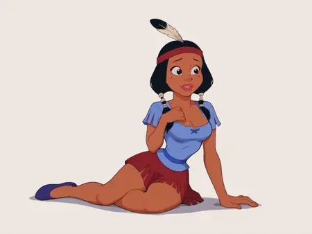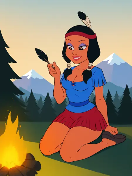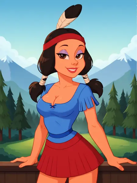 Trigger words: Minihoohawaifu, feather hair ornament, skirt, blue shirt, eyeshadow, lipstick, dark-skinned female,