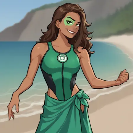 可选:深色皮肤,长棕色头发,绿色眼睛,绿色紧身衣,白色手套