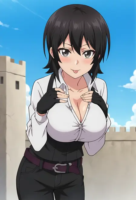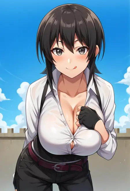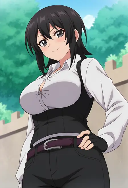 • elnakakushi、中程度の胸、白シャツ、カッターシャツ、黒ベスト、黒手袋、フィンガーレスグローブ、ベルト、黒パンツ