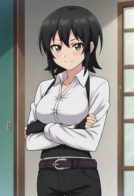elnakakushi, medium breasts, white shirt, collared shirt, black vest, black gloves, fingerless gloves, belt, black pants,