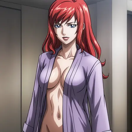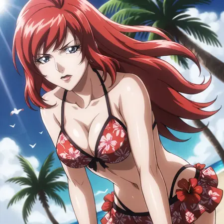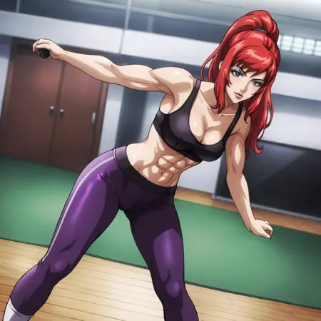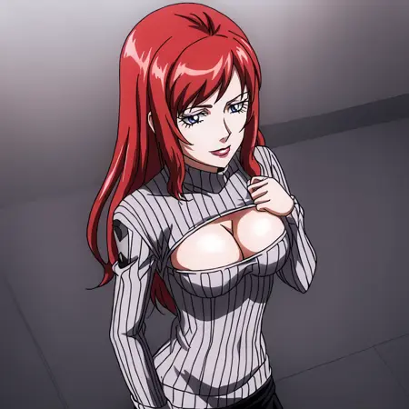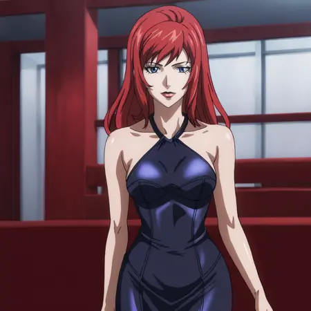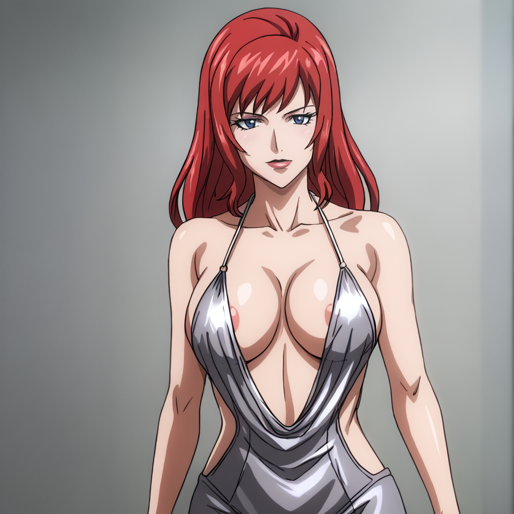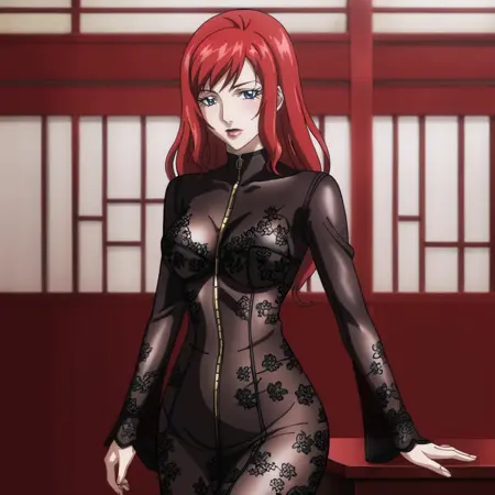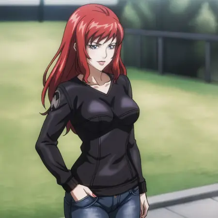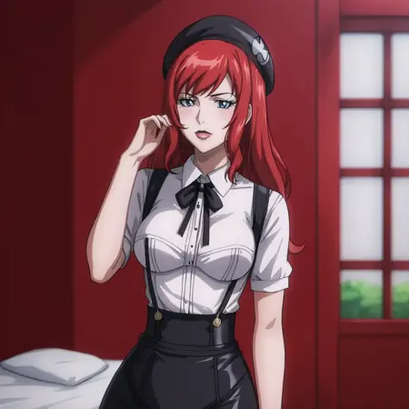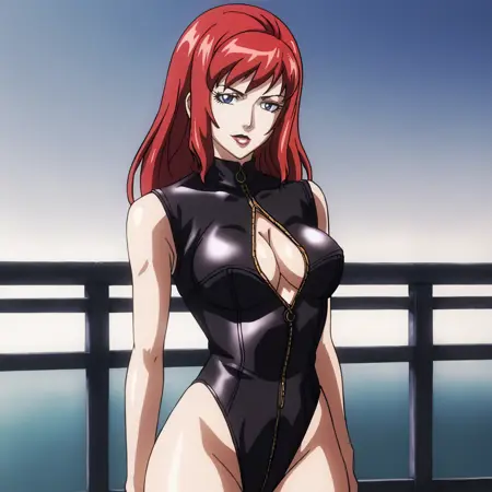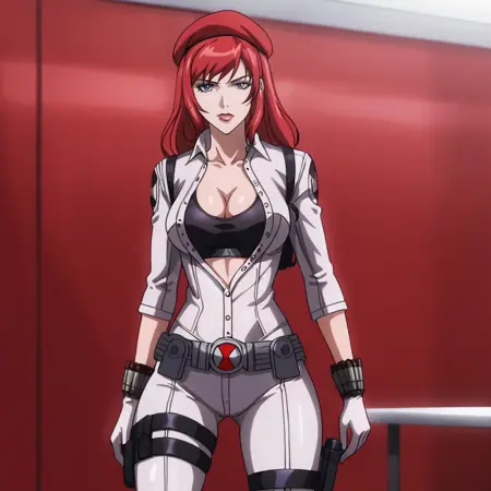 - 트리거: BlackWidowAnime, 1girl, bodysuit, red hair, long hair, medium breasts, gloves, holster, makeup, zipper, uniform, cowboy shot, cleavage