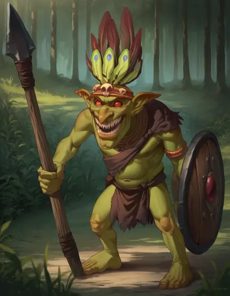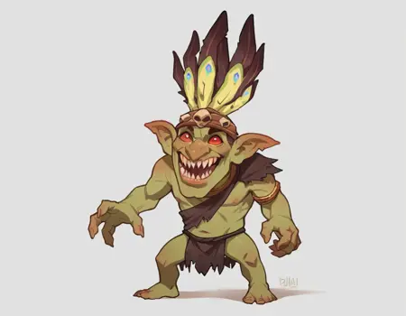 ForestGoblin, 날카로운 이빨, 녹색 피부, 머리장식, 붉은 눈, 붉은 비늘, 공허한 눈,