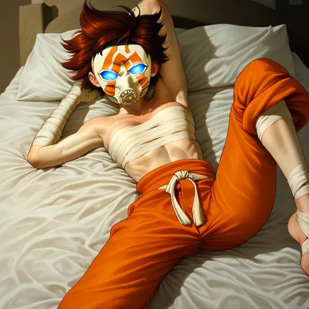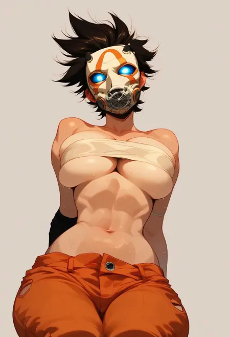 1girl, solo, orange pants, sarashi, mask, short hair, glowing eyes, bandages,