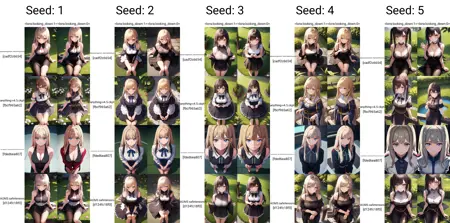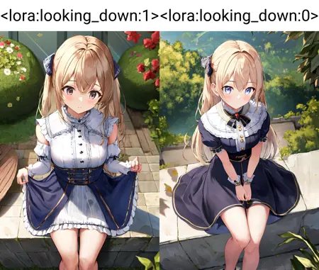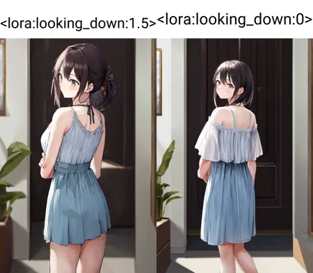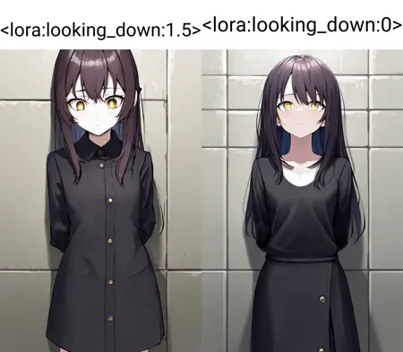 트리거만 사용하면 아래에서 위를 바라보는 시점이 생성되며, 이는 LoRA를 사용하지 않은 경우와 유사합니다. 시점이 명시될 때까지 눈에 띄는 변화가 없으므로, 예를 들어 from above, from side, facing viewer, **looking at viewer**와 같이 시점을 명시해야 합니다.