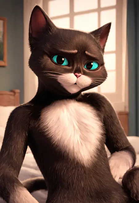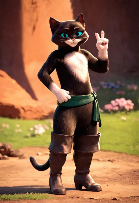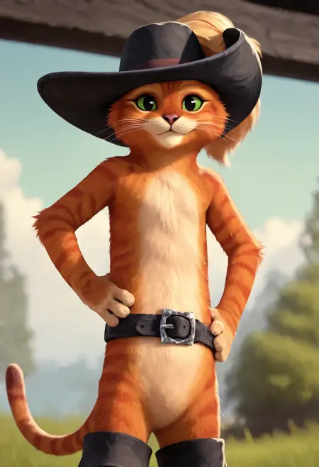 PussInBoots, anthro, 1boy, orange cat, two tone fur, yellow eyes, pink cat nose, cat ears (!if no hat!), black cloak (not cape!), hat, belt, cat tail, black boots
