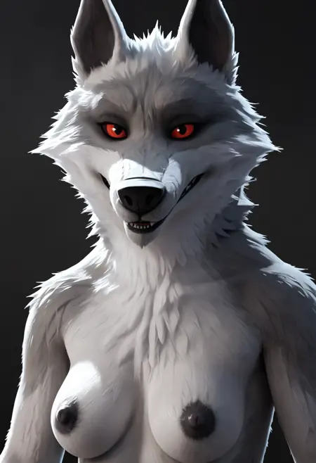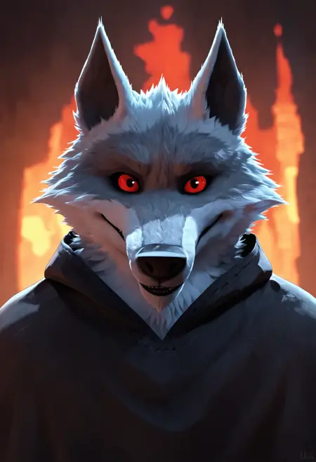 DeathWolf, anthro, 1boy, grey wolf, two tone fur, red eyes, black dog nose, dog ears, black cape (not cloak!), hand bandage, dog tail, pants