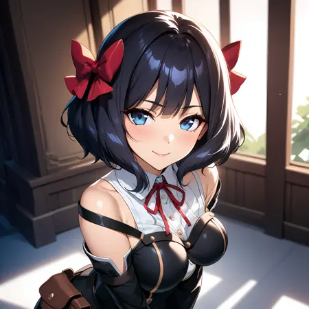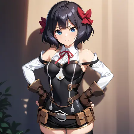 Activation tag is "tino_shade, 1girl, short hair, black hair, red ribbon, blue eyes, medium breasts, white shirt, ribbon on neck, black vest, strapped vest, off shoulder, sleeves, brown gloves, fingerless gloves, wide hips, belt, pouch, black thigh high, black thigh boots, " and has "anime coloring" tag for style change.