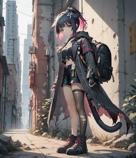 jessica, green eyes, cat ears, cat tail, ponytail, multicolored hair,