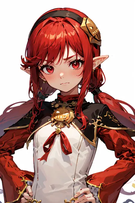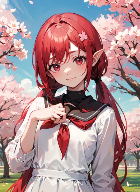 red long sleeves,red skirt,low twintails,hairband,jewelry,shirt