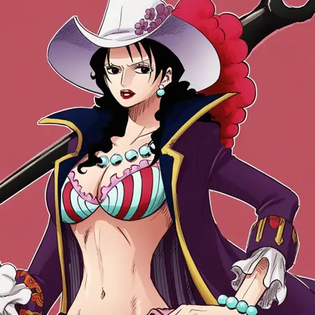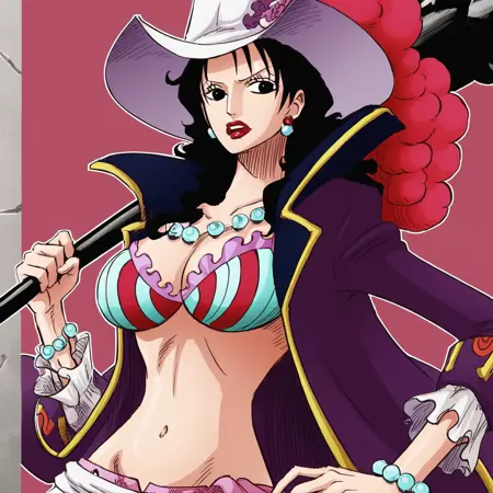 AlvidaOP, 1girl, solo, black hair, long hair, black eyes, large breast, cleavage, jewelry, hat, cape, pants, necklace, pearl, earrings, lips, makeup, midriff, navel, bikini, open clothes, belt, bracelet, cloak, hat ornament, red lips, shoes, high heels,
