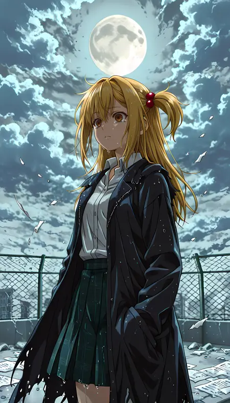 yuuri amagake, long blonde hair, solo, brown eyes, school uniform, red sports jacket, side ponytail, hair decoration, hair ornament, green tie, green skirt