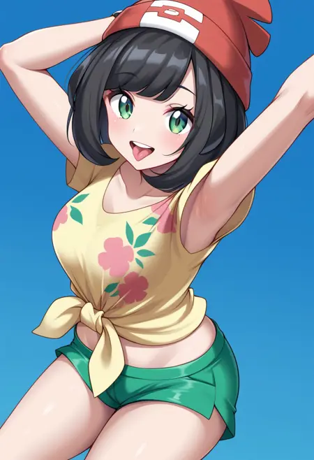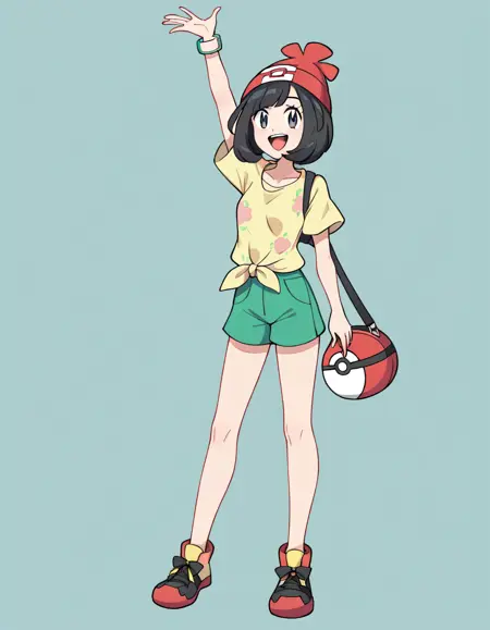 | 학습된 단어 | Selene, Pokemon, black hair with side bangs, pale skin, slate grey eyes, red beanie, geometric pattern, white t-shirt with knot and pastel floral design, green shorts, black, red and yellow crossbody bag, black and red sneakers with yellow laces복사됨! |