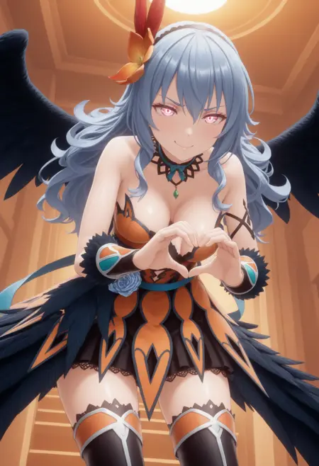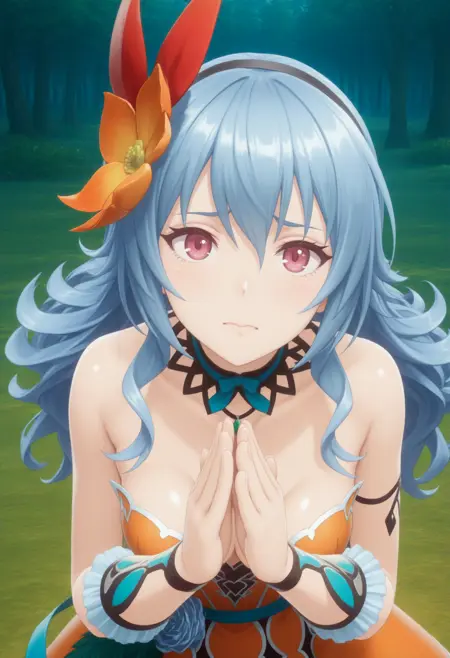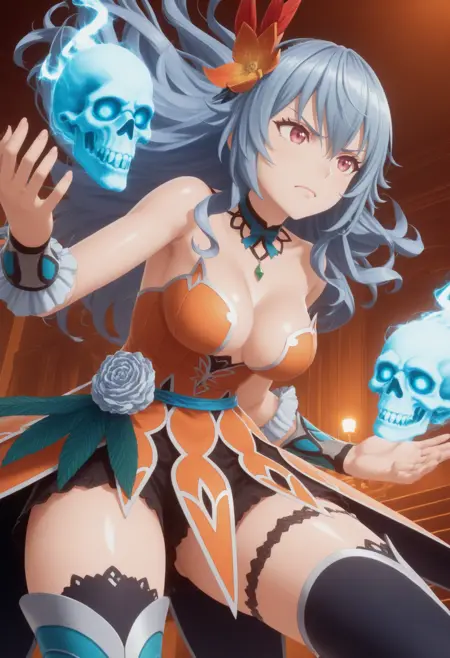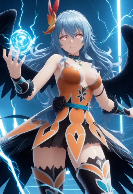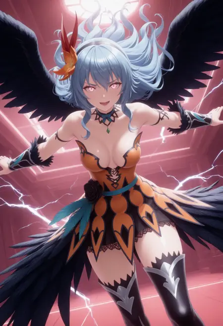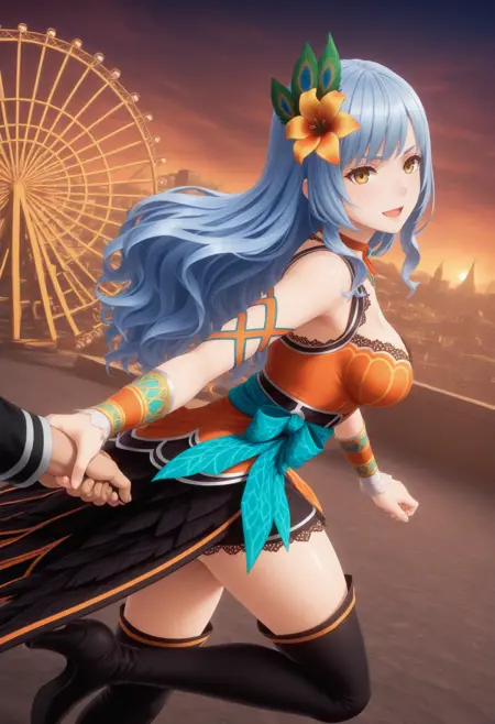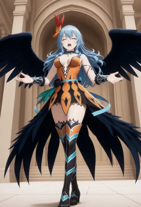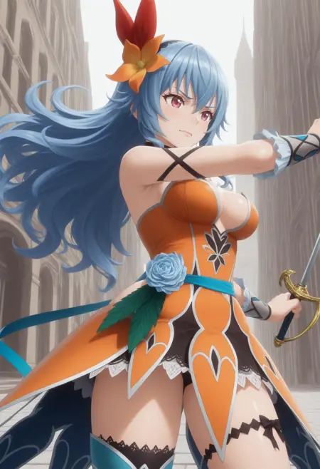 このゲームは古く、2024年10月24日にリメイク版が発売されるまで、公式であっても多様なロックブーケが描かれてきました。ご自身が思い描く要素を自由に取り入れて作成してください。作例では「long hair, blue hair, hair ornament, hair flower, orange dress, bare shoulders, floating hair, orange eyes」を使用しており、第二形態には「black wings」を追加しています。ロックブーケといえば幽霊や黒いファー、髪には花ではなくリボンという意見もあると思いますので、ご自身のお好みでアレンジしてください。