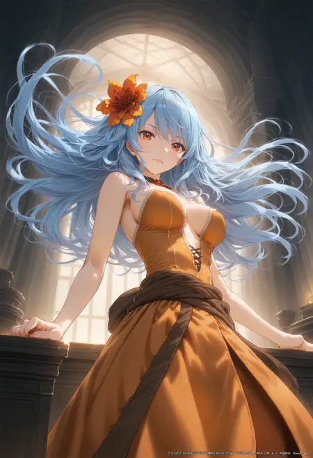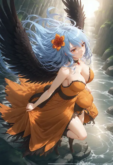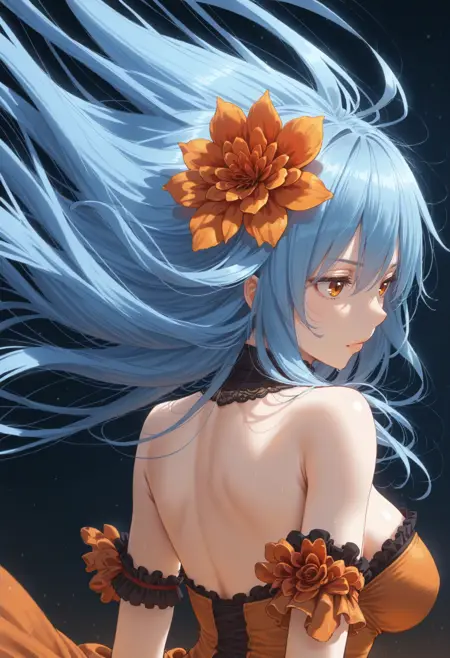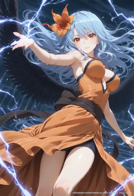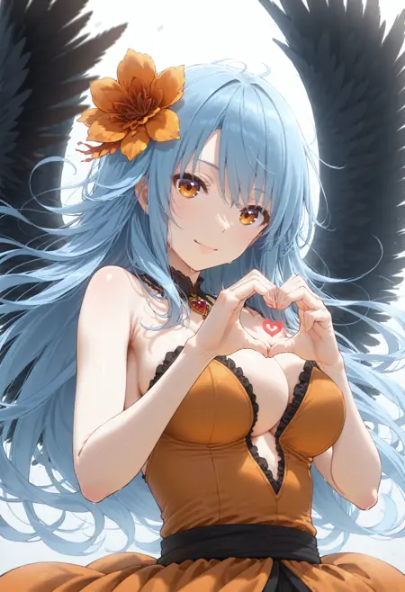 这是一款经典老游戏,直至2024年10月24日重制版发售前,官方也已推出过多种不同风格的洛克·布凯形象,因此请根据你心中所想进行创作。示例使用了以下提示词:long hair, blue hair, hair ornament, hair flower, orange dress, bare shoulders, floating hair, orange eyes,第二形态追加了 black wings。也可能有人认为,洛克·布凯应该带有幽灵感、黑色皮毛,或头发上是丝带而非花朵——请根据个人喜好自由调整。
