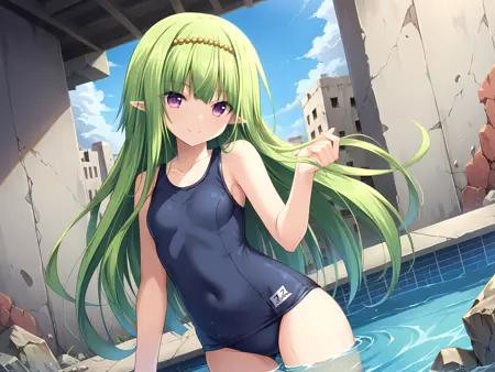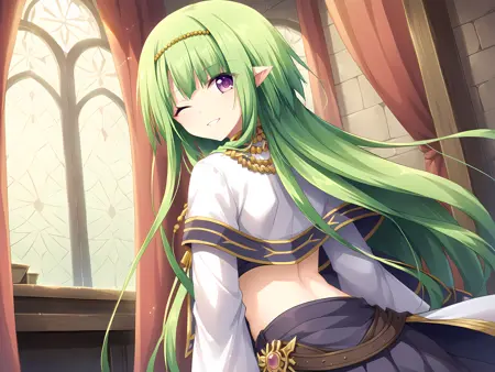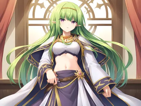 eushully, eiferia, 1girl, pointy ears, green hair, long hair, purple eyes, skirt, midriff, jewelry, navel, necklace,