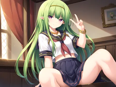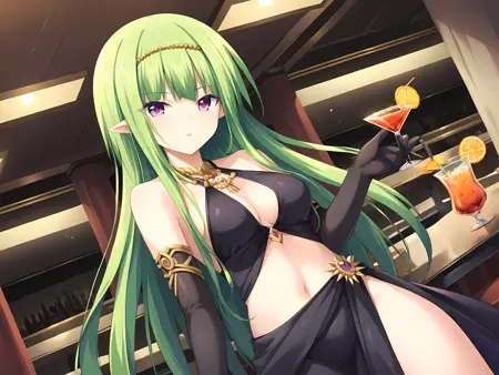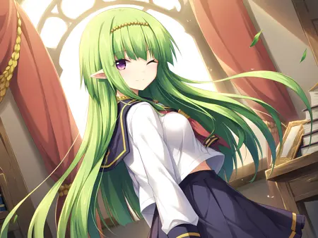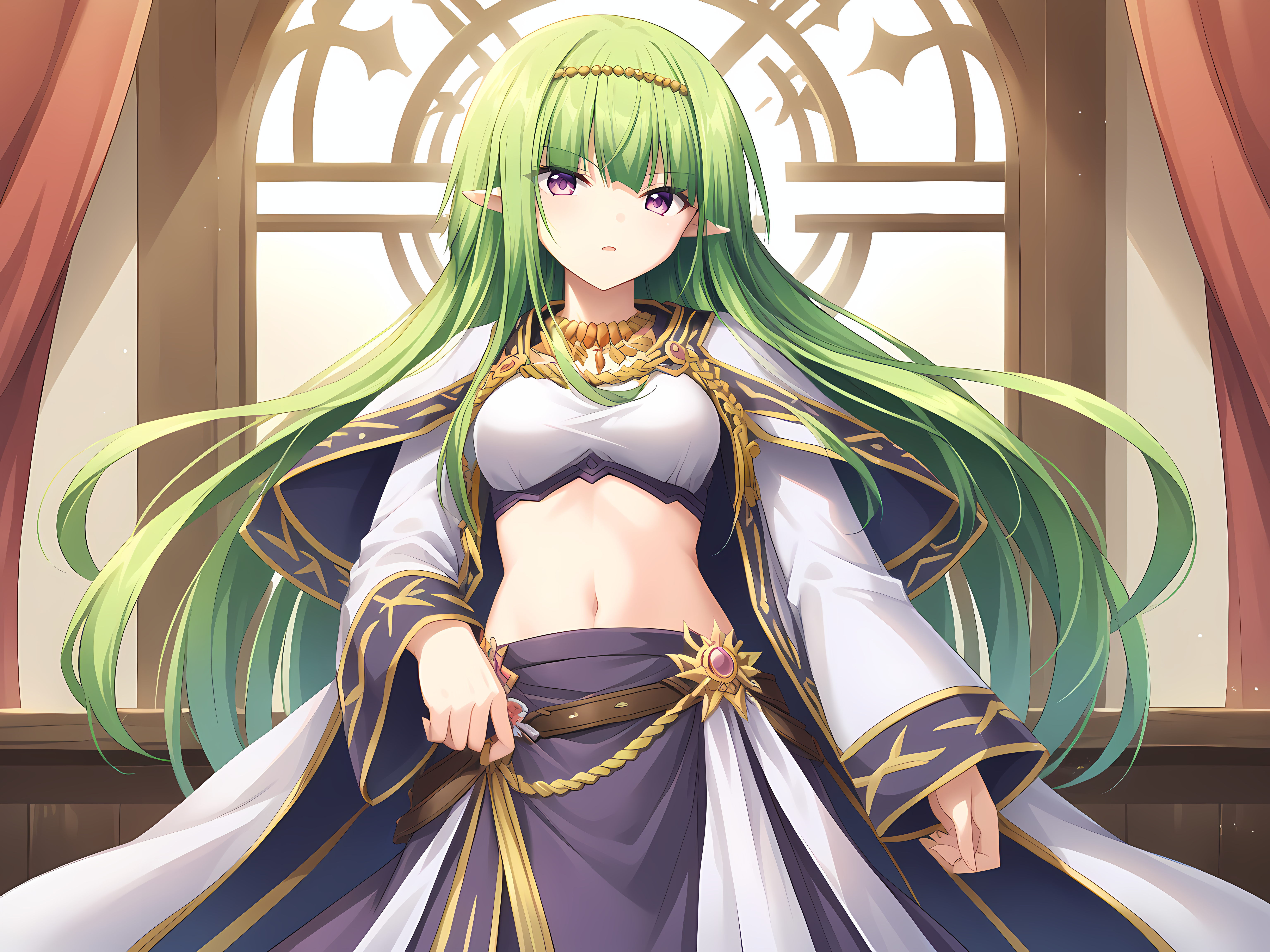 eushully, 아이페리아, 1girl, 뾰족한 귀, 녹색 머리, 긴 머리, 보라색 눈, 치마, 복부, 보석, 배꼽, 목걸이